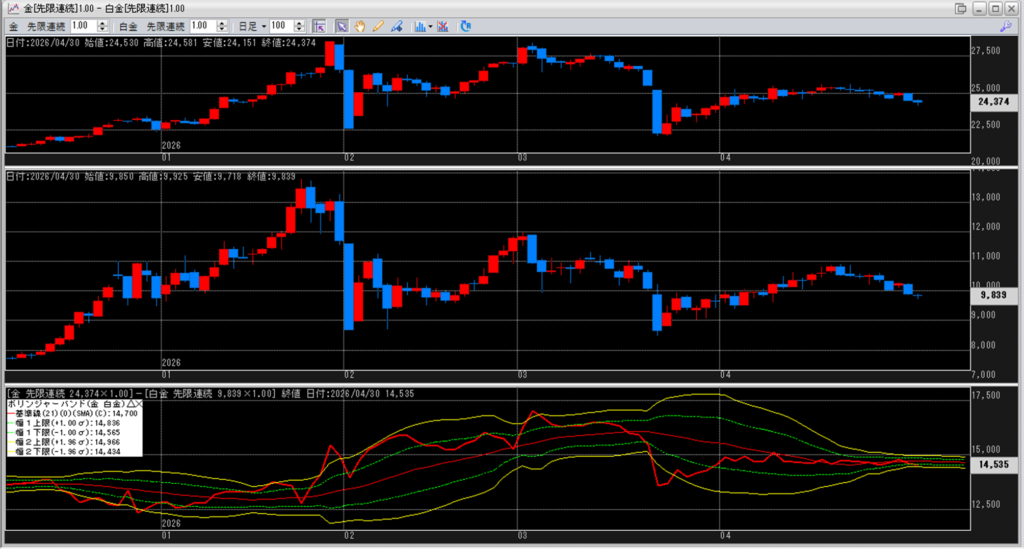 金白金の鞘をボリンジャーバンドで見ていきます。