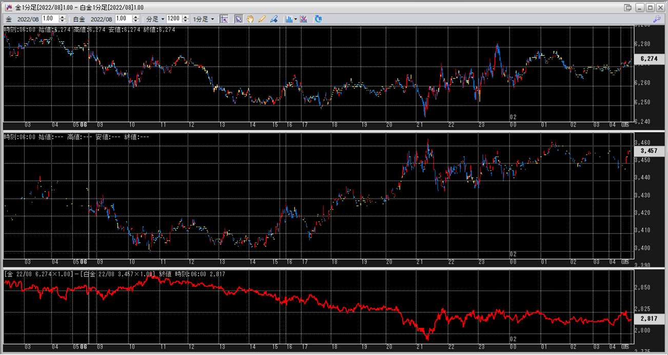 2021年10月1日8:45~10月2日6:00 金白金鞘値動きのチャートを張り付けています。