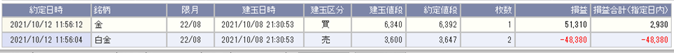 また、鞘拡大の仕掛け金買い1枚-白金売り2枚を2組持っておりましたが、