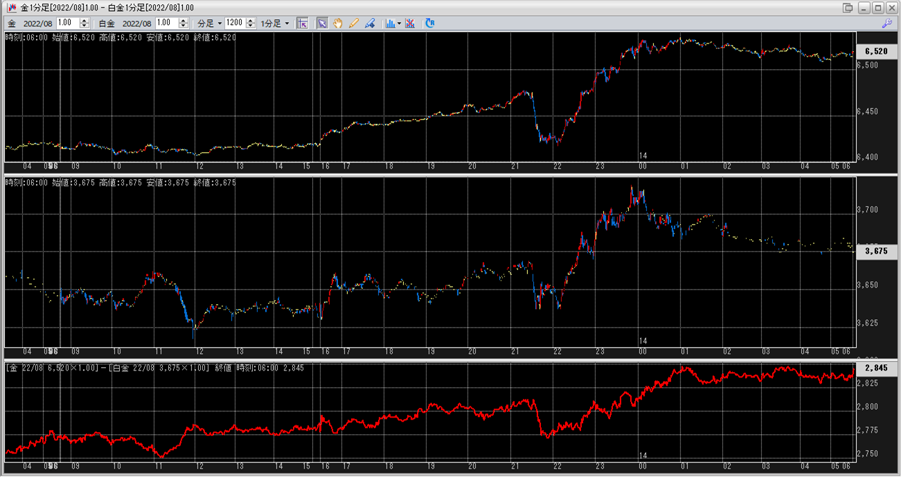 下:金白金鞘(金白金の価格差 = 金1グラムの価格 - 白金1グラムの価格)