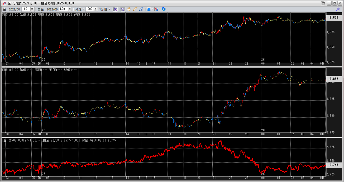 下:金白金鞘(金白金の価格差 = 金1グラムの価格 - 白金1グラムの価格)
