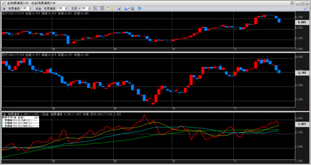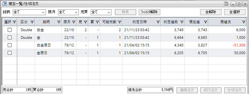 本日、私は鞘拡大の仕掛け金買い1枚-白金売り2枚を1組、建てました。