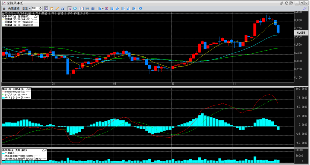 移動平均線の中で一番上に位置している短期線6,795円を割り込み、