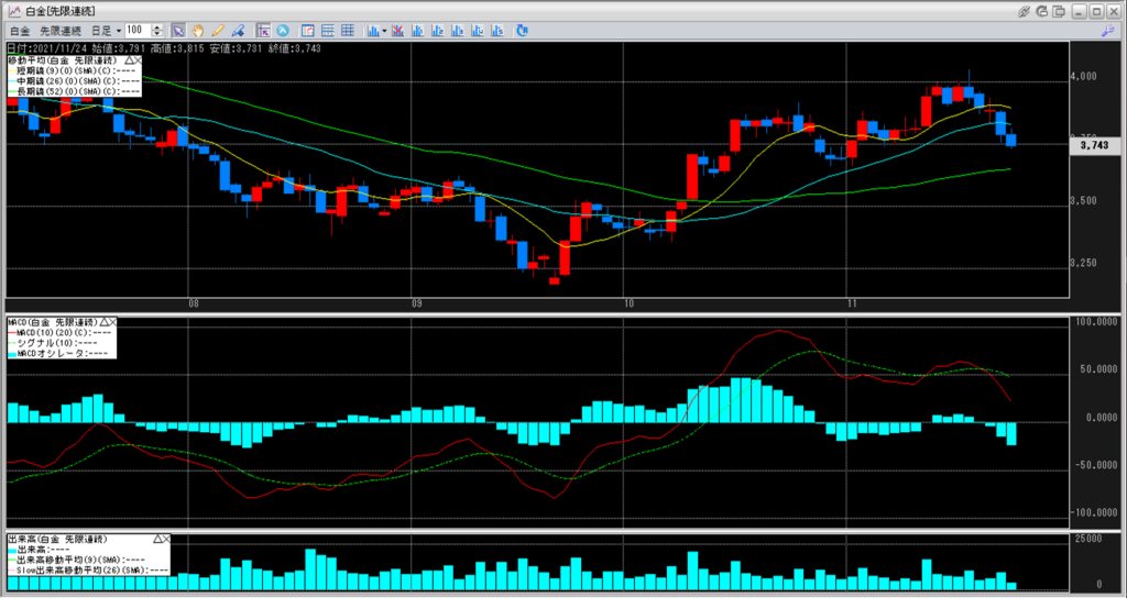 白金は、下値3,750円、上値約4,000円のボックス圏の