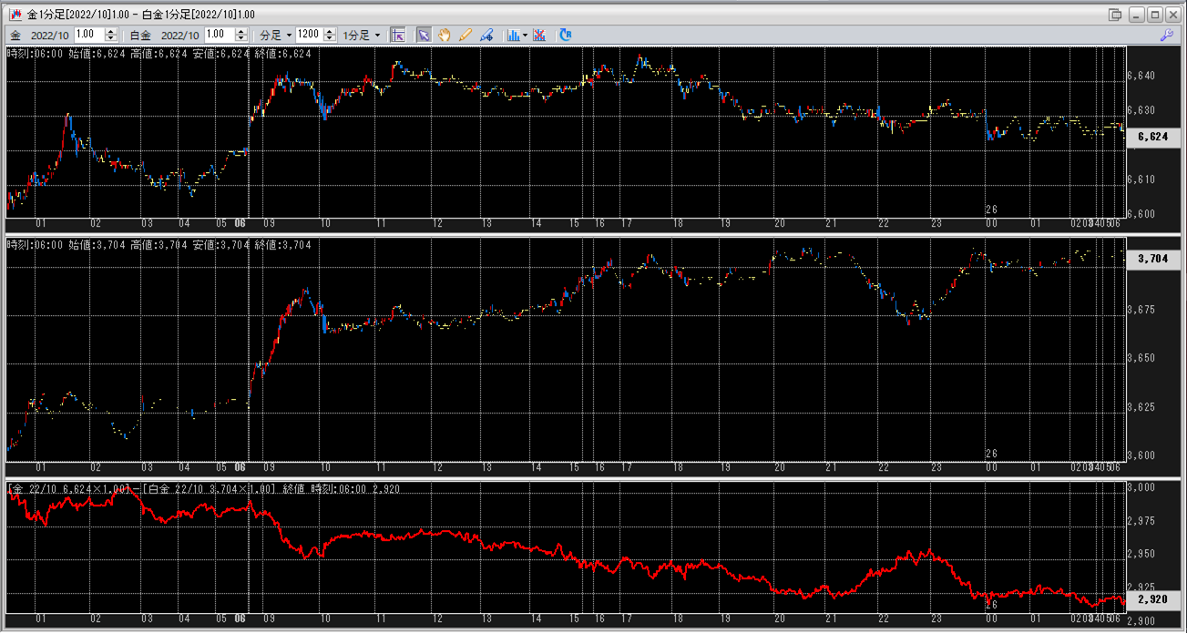 さて、また、鞘拡大の仕掛け金買い1枚-白金売り2枚を仕掛けるタイミングを
