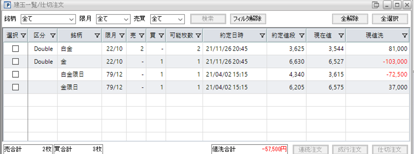 そして、思わず、鞘拡大の仕掛け金買い1枚-白金売り2枚を新規で建てています。