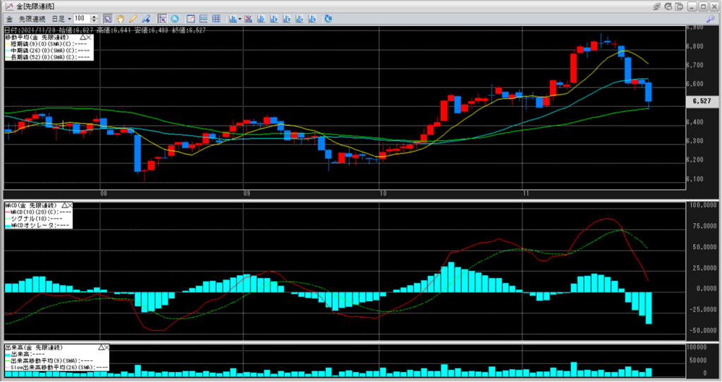 金は、移動平均線の中で一番下に位置している長期線を割るのかどうか。