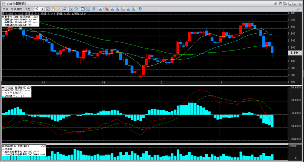 白金は、 ボックス圏の下値3,450円、上値3,600円辺りに留まるのか否か。
