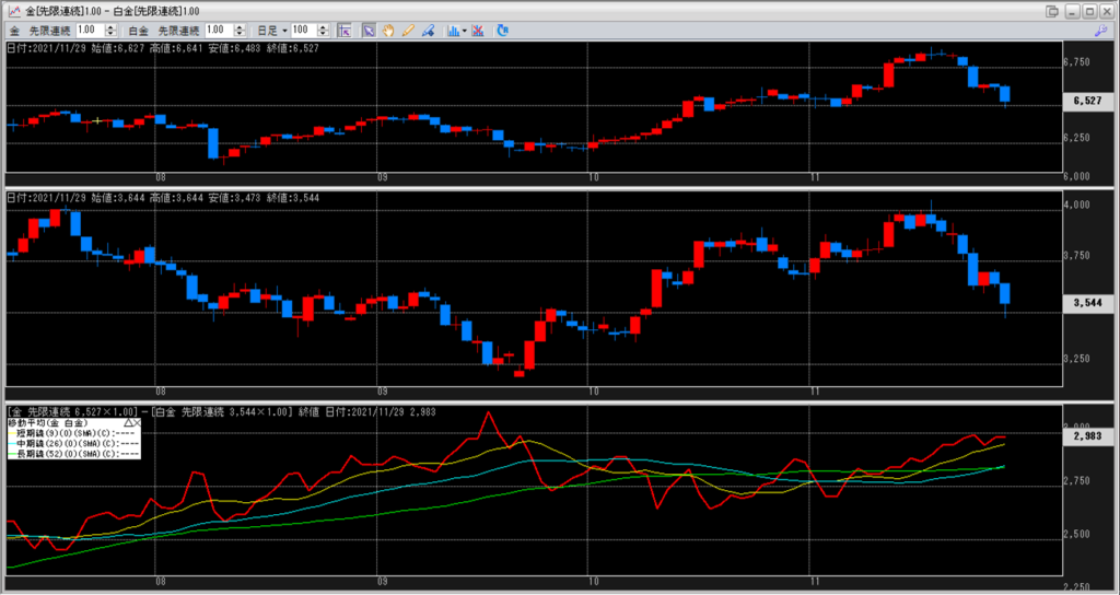 下:金白金鞘(金白金の価格差 = 金1グラムの価格 - 白金1グラムの価格)