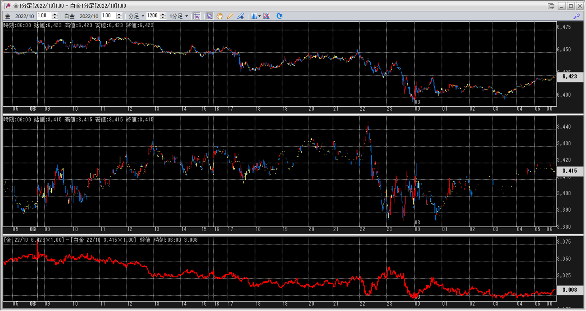下:金白金鞘(金白金の価格差 = 金1グラムの価格 - 白金1グラムの価格)
