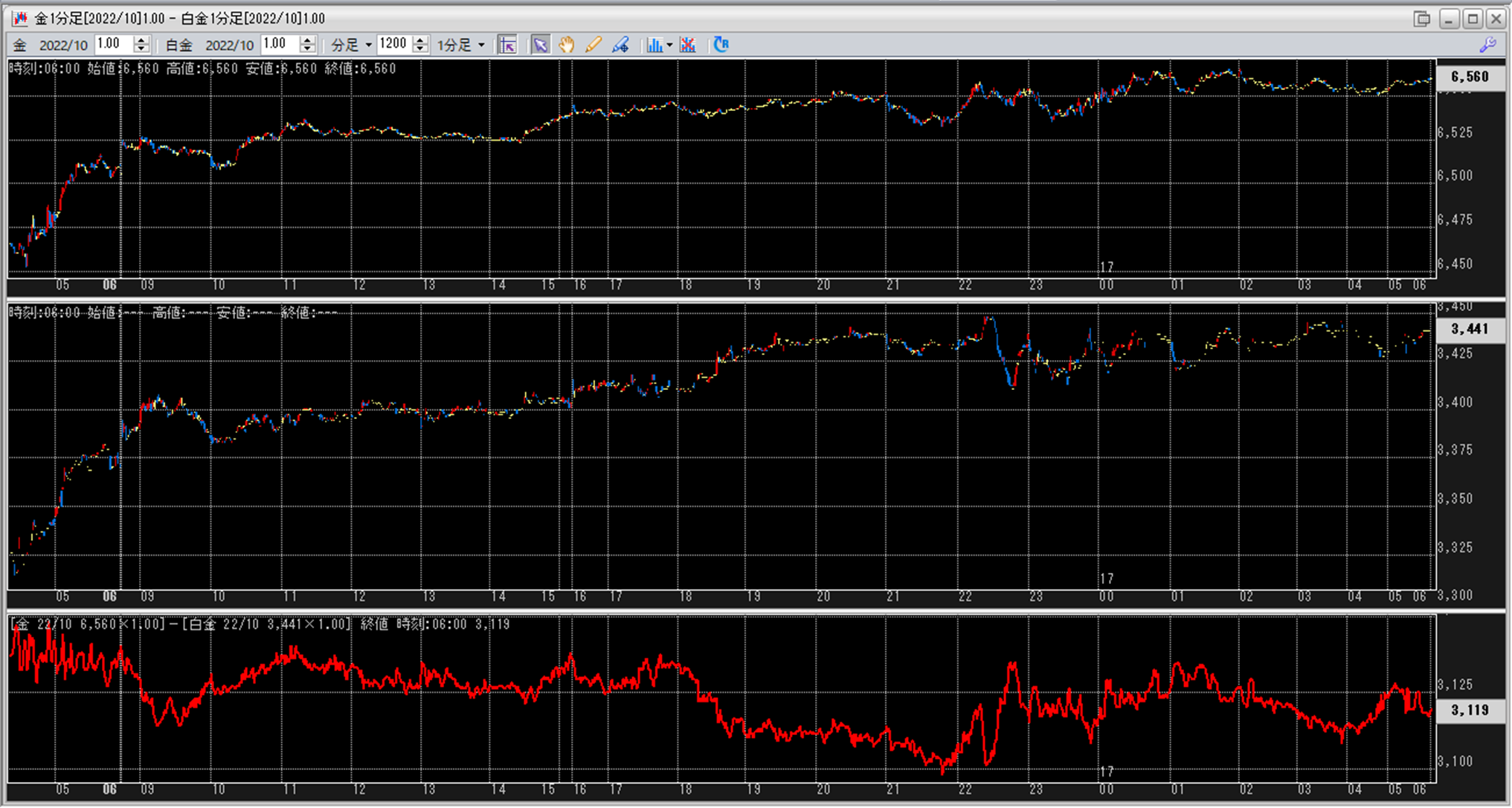 下:金白金鞘(金白金の価格差 = 金1グラムの価格 - 白金1グラムの価格)