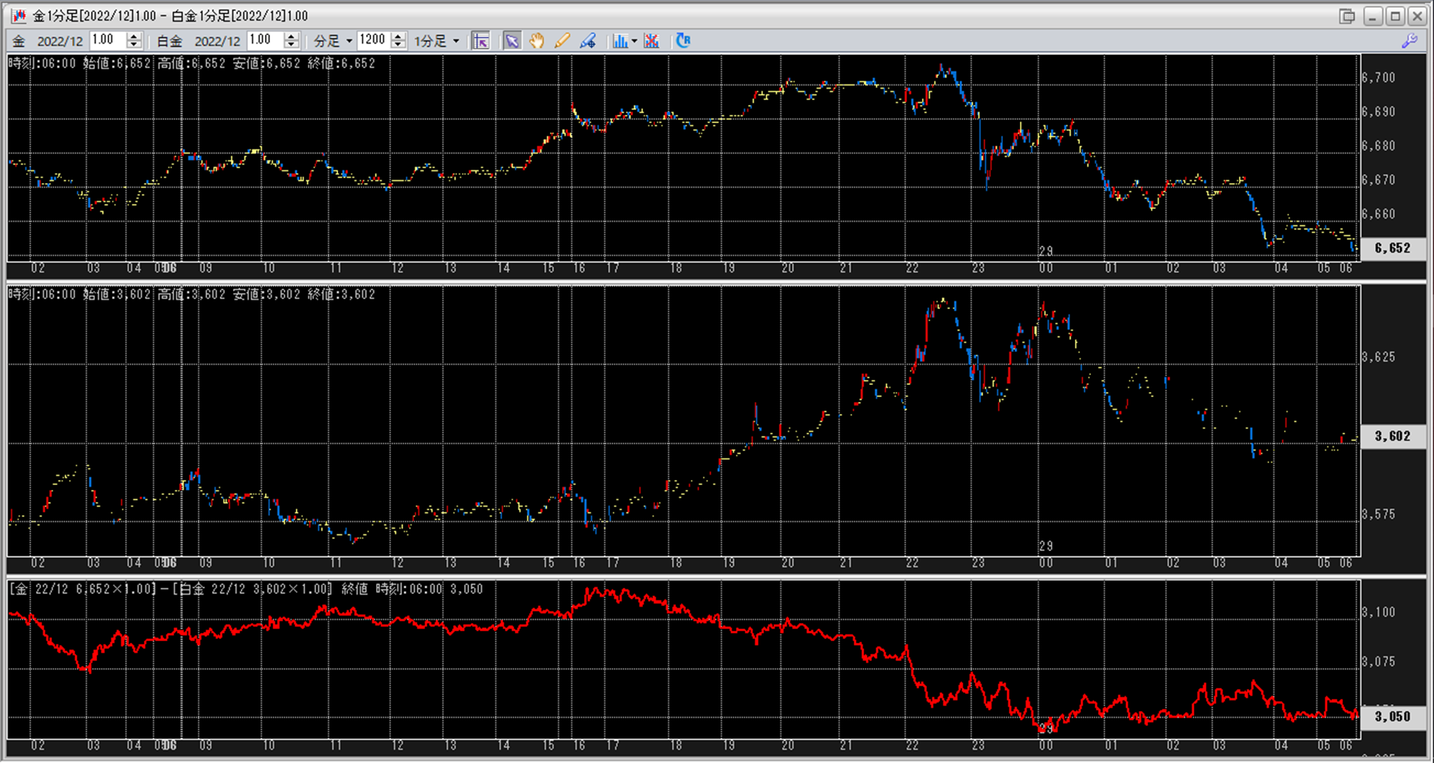 下:金白金鞘(金白金の価格差 = 金1グラムの価格 - 白金1グラムの価格)