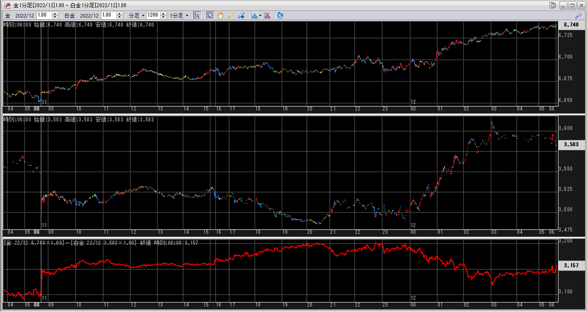 下:金白金鞘(金白金の価格差 = 金1グラムの価格 - 白金1グラムの価格)