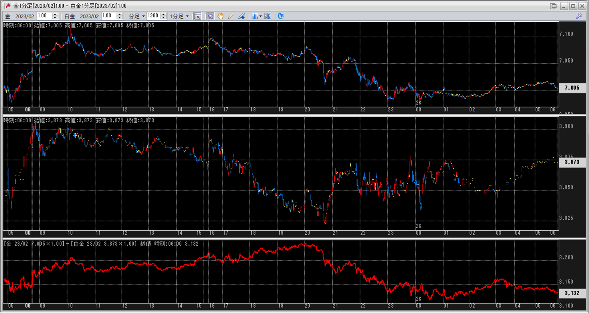 下:金白金鞘(金白金の価格差 = 金1グラムの価格 - 白金1グラムの価格)