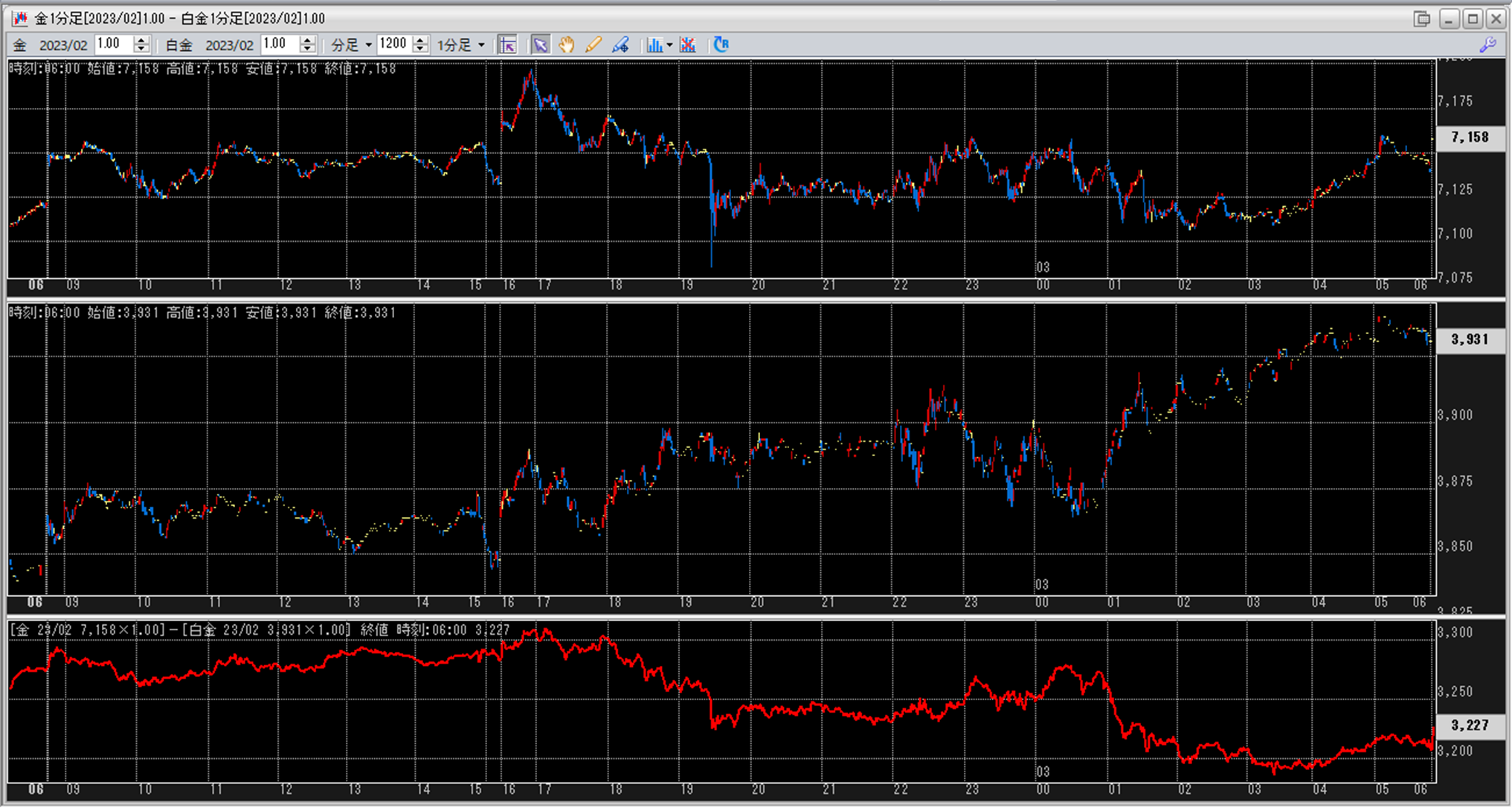 ここで鞘拡大の仕掛け金買い1枚-白金売り2枚を仕掛けていくべきか。
