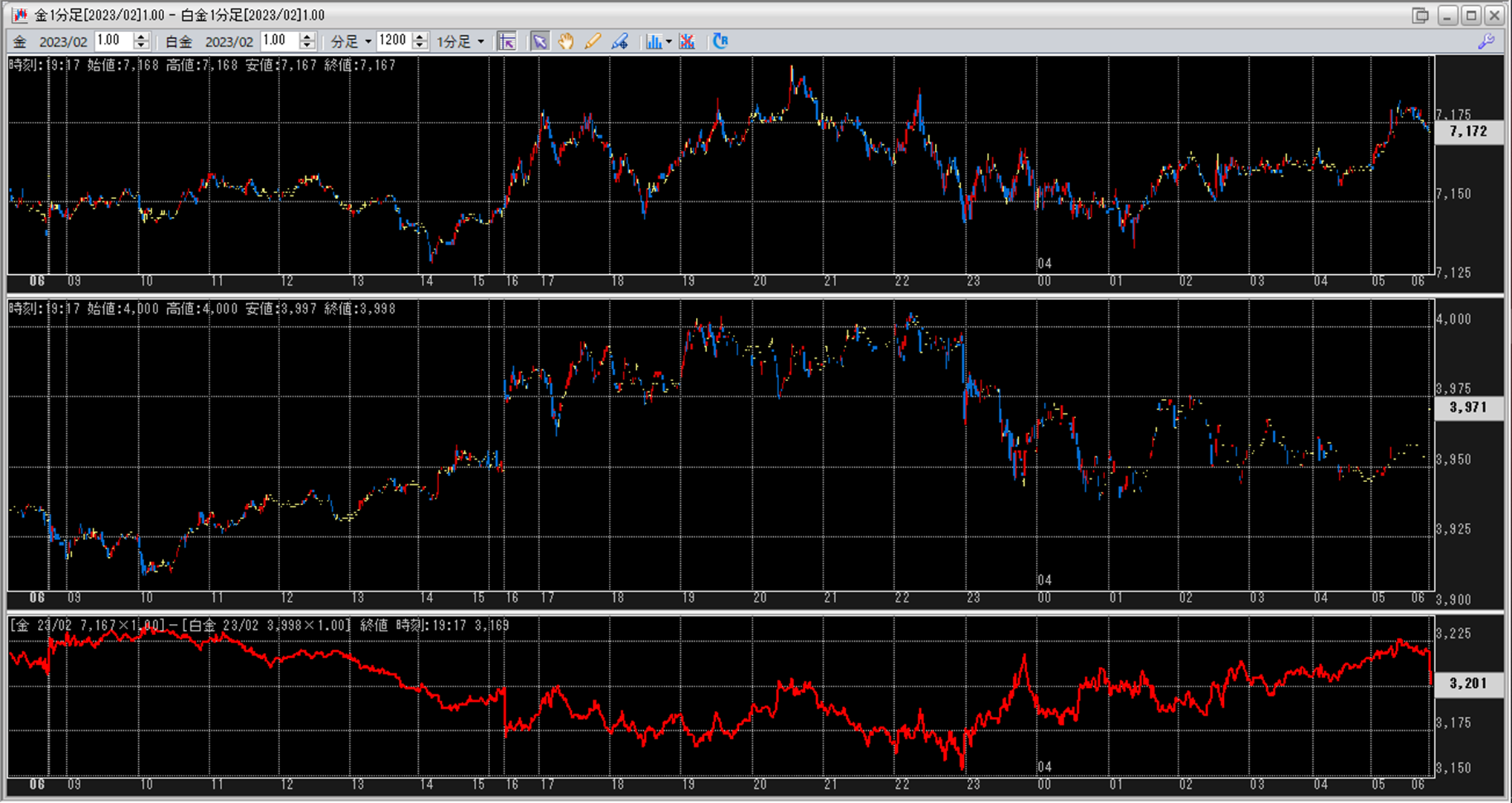 ここで鞘拡大の仕掛け金買い1枚-白金売り2枚を仕掛けていくべきか。