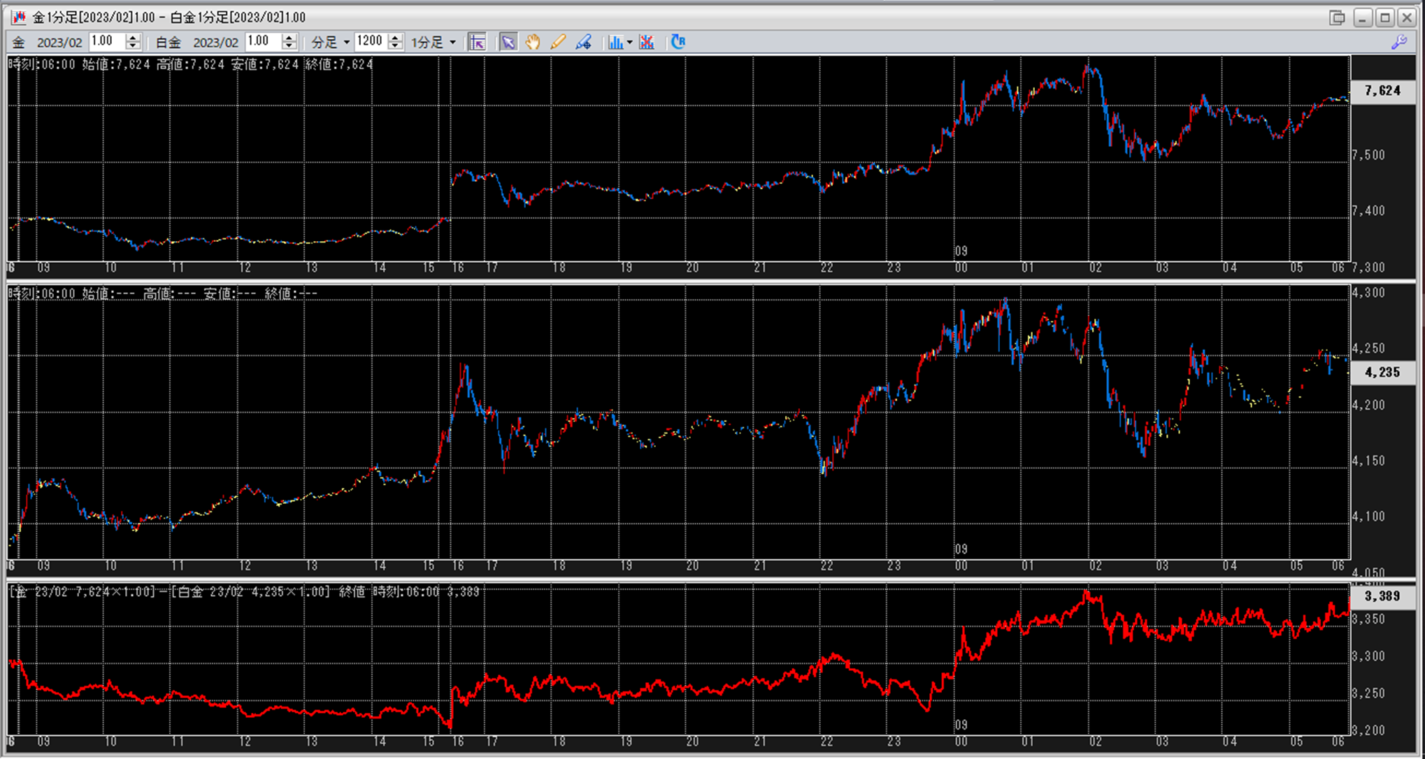 下:金白金鞘(金白金の価格差 = 金1グラムの価格 - 白金1グラムの価格)