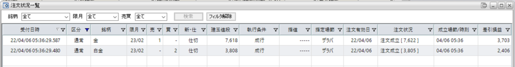 そして、鞘拡大の仕掛け金買い1枚-白金売り2枚を1組、建てています。