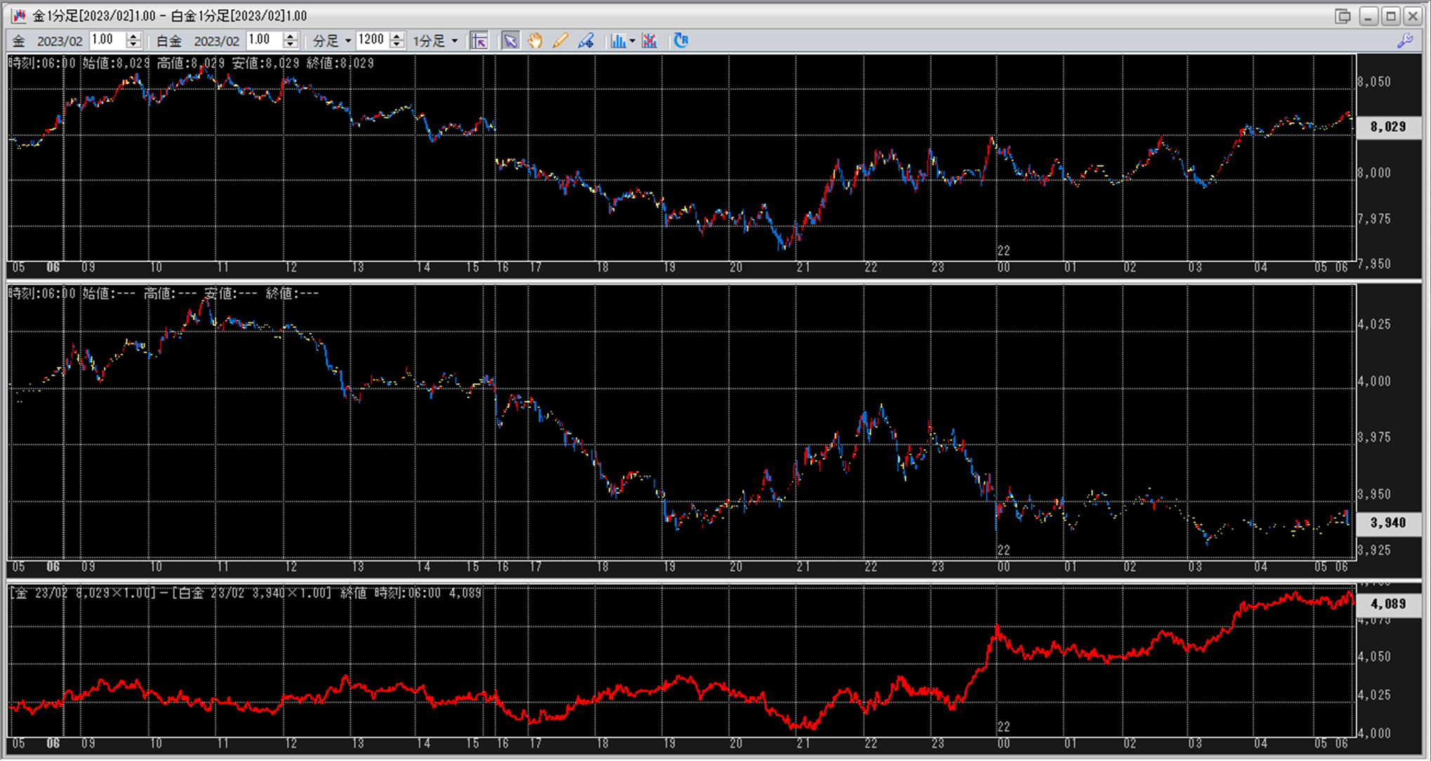 下:金白金鞘(金白金の価格差 = 金1グラムの価格 - 白金1グラムの価格)