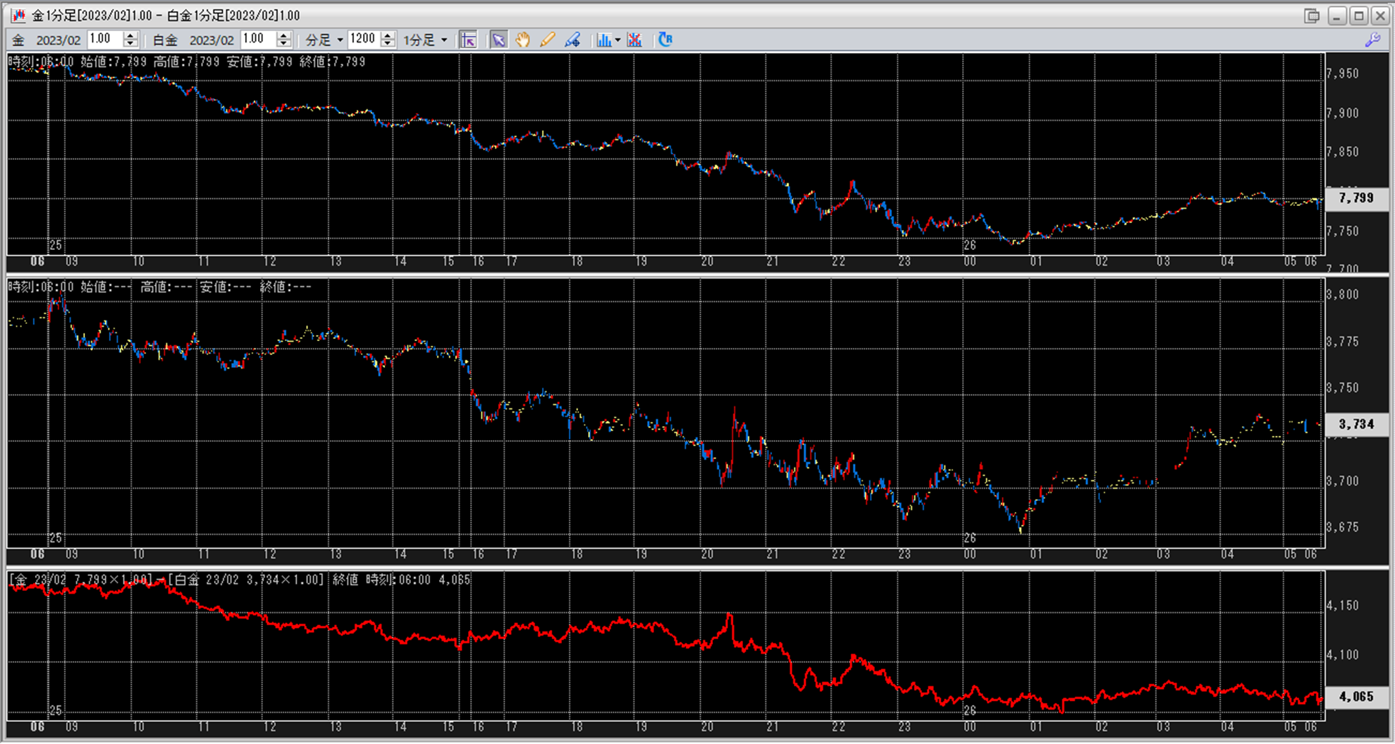 下:金白金鞘(金白金の価格差 = 金1グラムの価格 - 白金1グラムの価格)