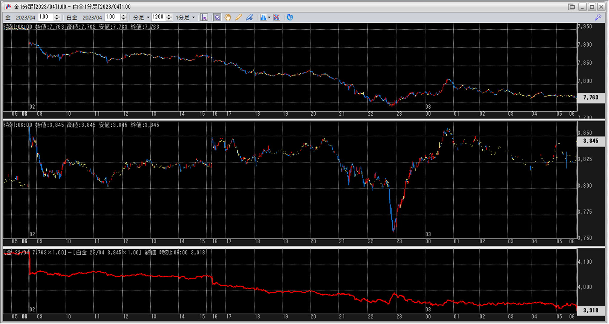 下:金白金鞘(金白金の価格差 = 金1グラムの価格 - 白金1グラムの価格)