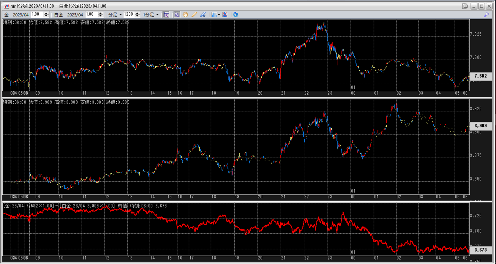 現在、金白金鞘拡大の仕掛け金買い1枚-白金売り2枚を1組、保持しており、