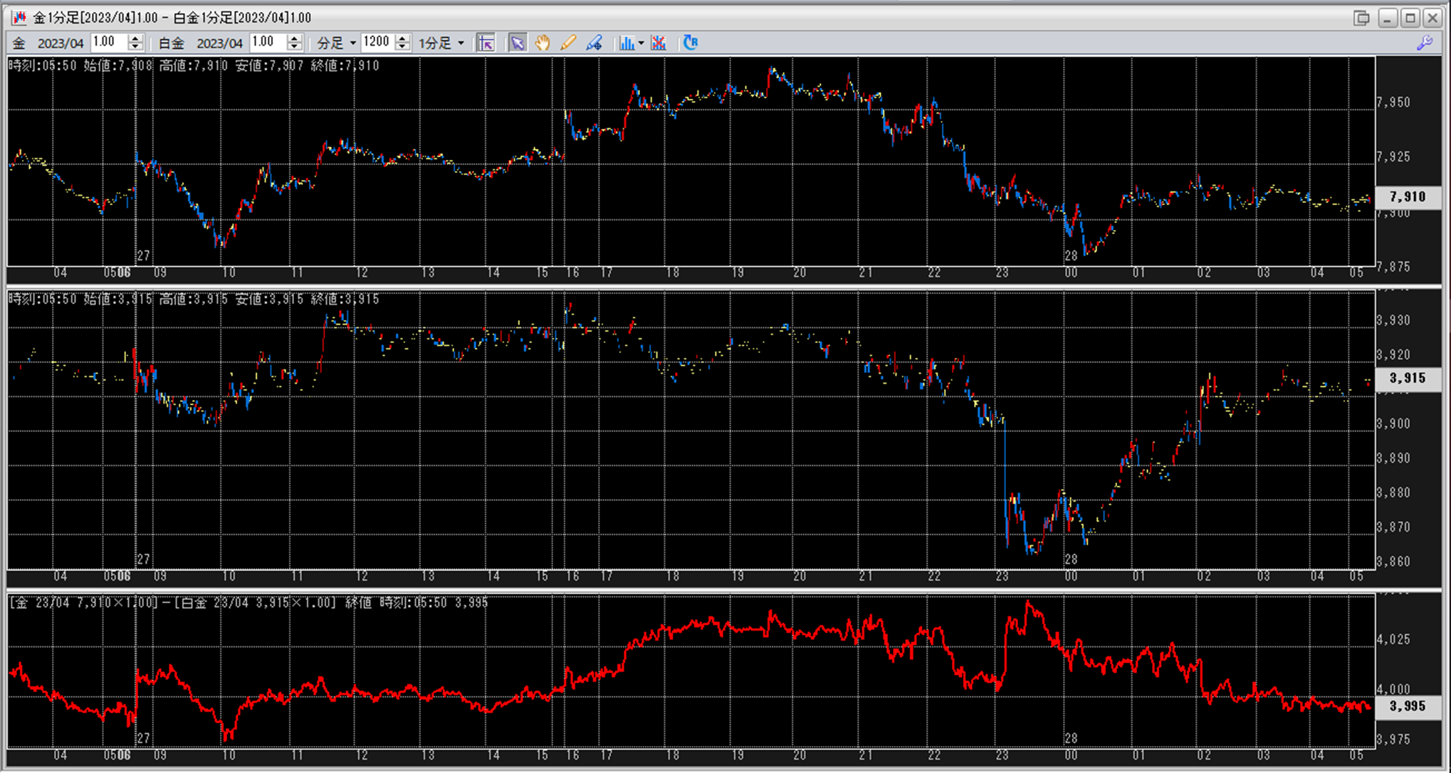 下:金白金鞘(金白金の価格差 = 金1グラムの価格 - 白金1グラムの価格)