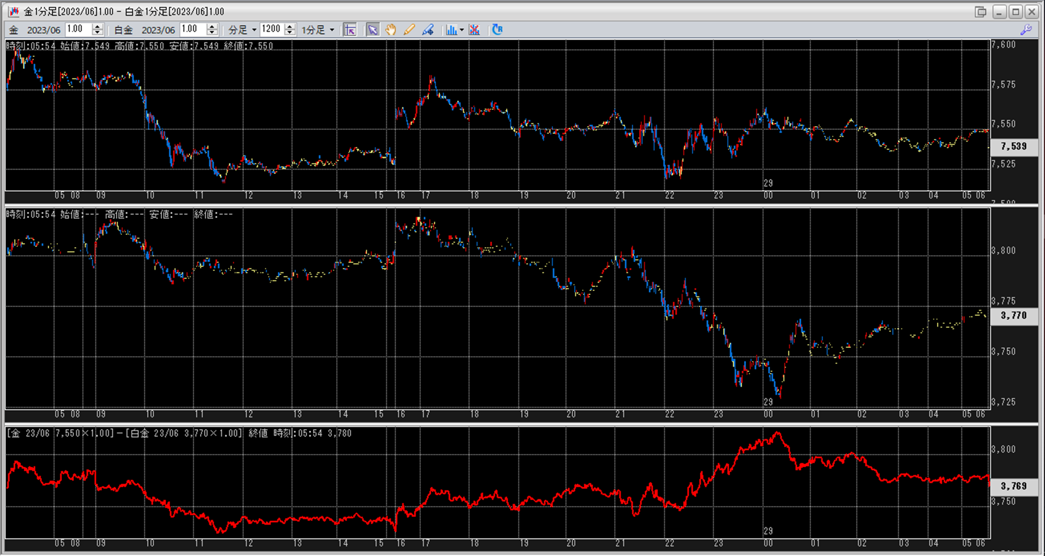 それとも鞘縮小の仕掛け金売り1枚-白金買い2枚を仕切っていくのか、