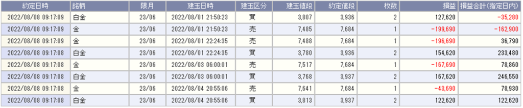現在、鞘拡大の仕掛金買い1枚-白金売り2枚を3組を4組を保持しています。