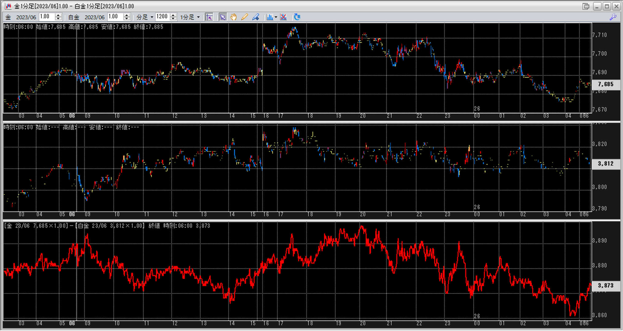 下:金白金鞘(金白金の価格差 = 金1グラムの価格 - 白金1グラムの価格)