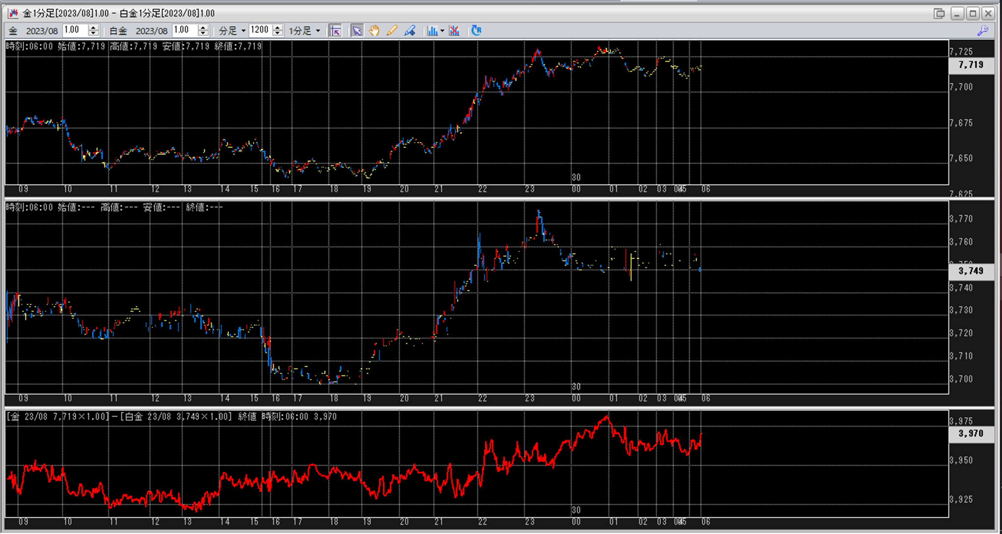 下:金白金鞘(金白金の価格差 = 金1グラムの価格 - 白金1グラムの価格)