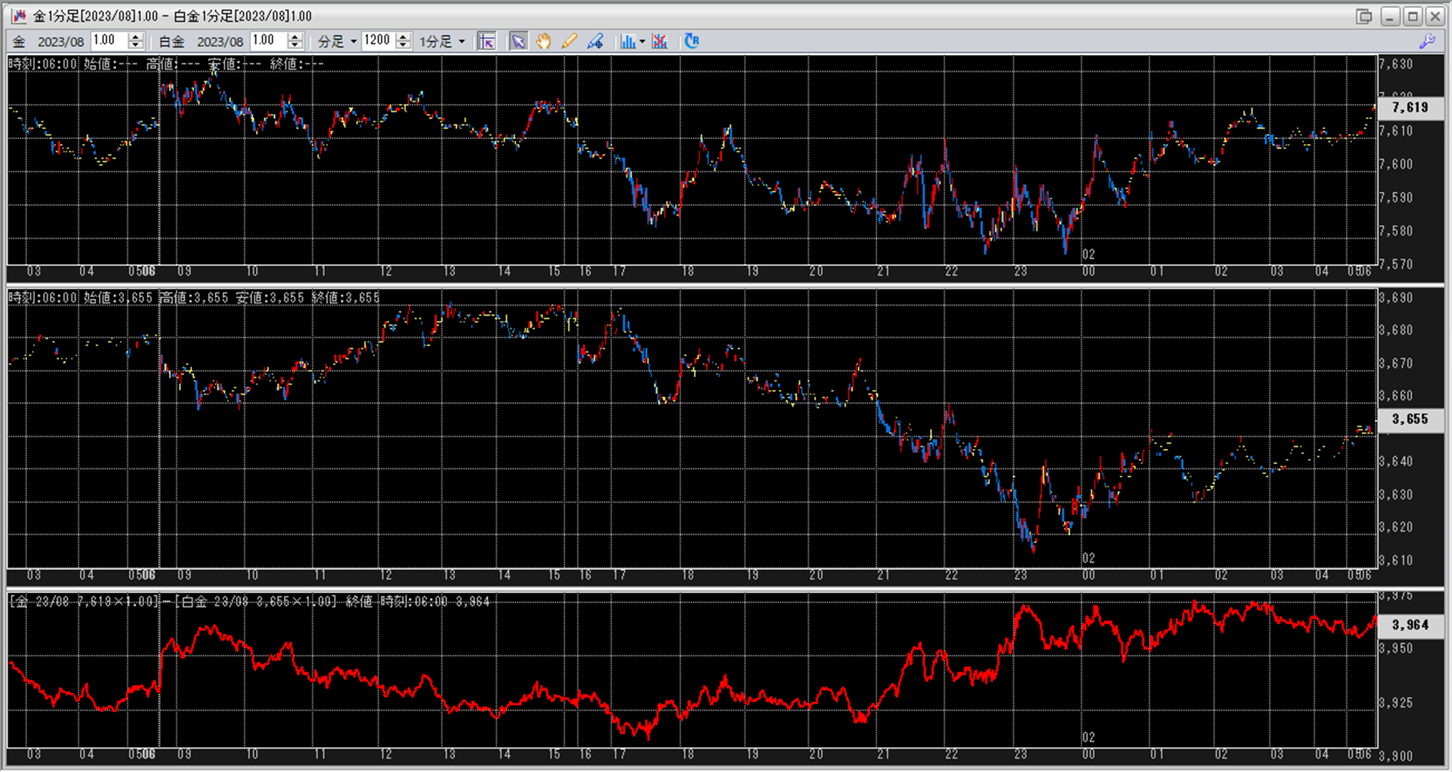下:金白金鞘(金白金の価格差 = 金1グラムの価格 - 白金1グラムの価格)