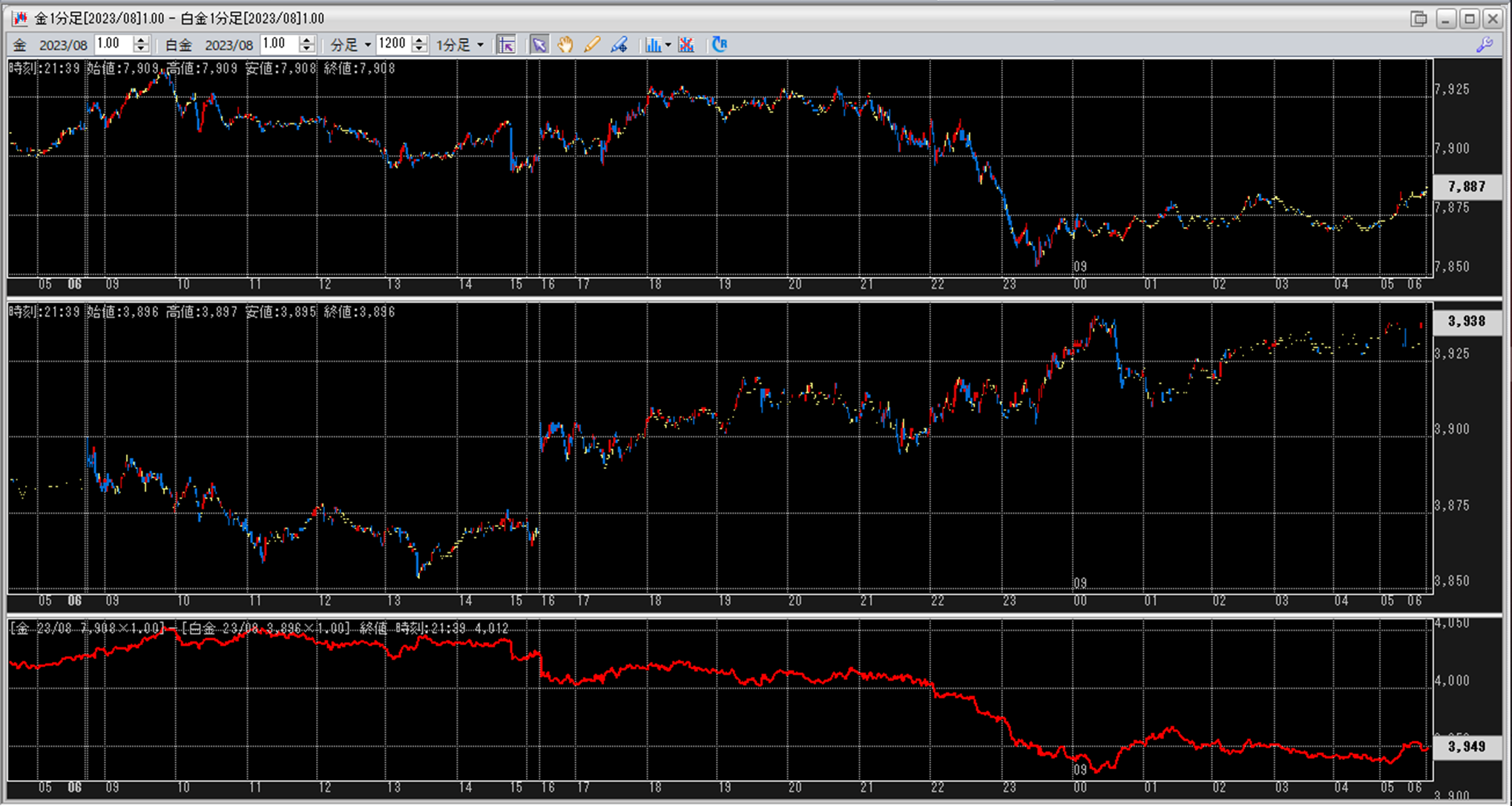 下:金白金鞘(金白金の価格差 = 金1グラムの価格 - 白金1グラムの価格)