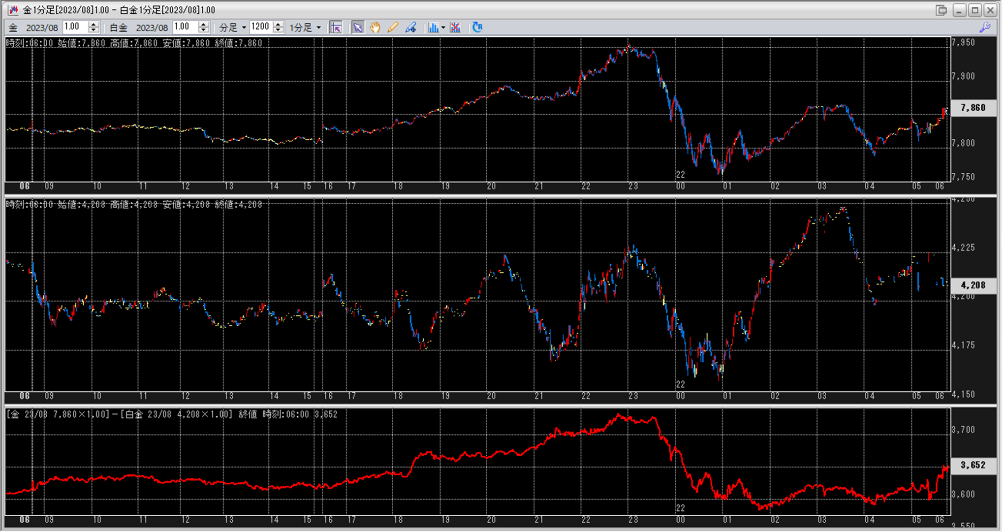 下:金白金鞘(金白金の価格差 = 金1グラムの価格 - 白金1グラムの価格)