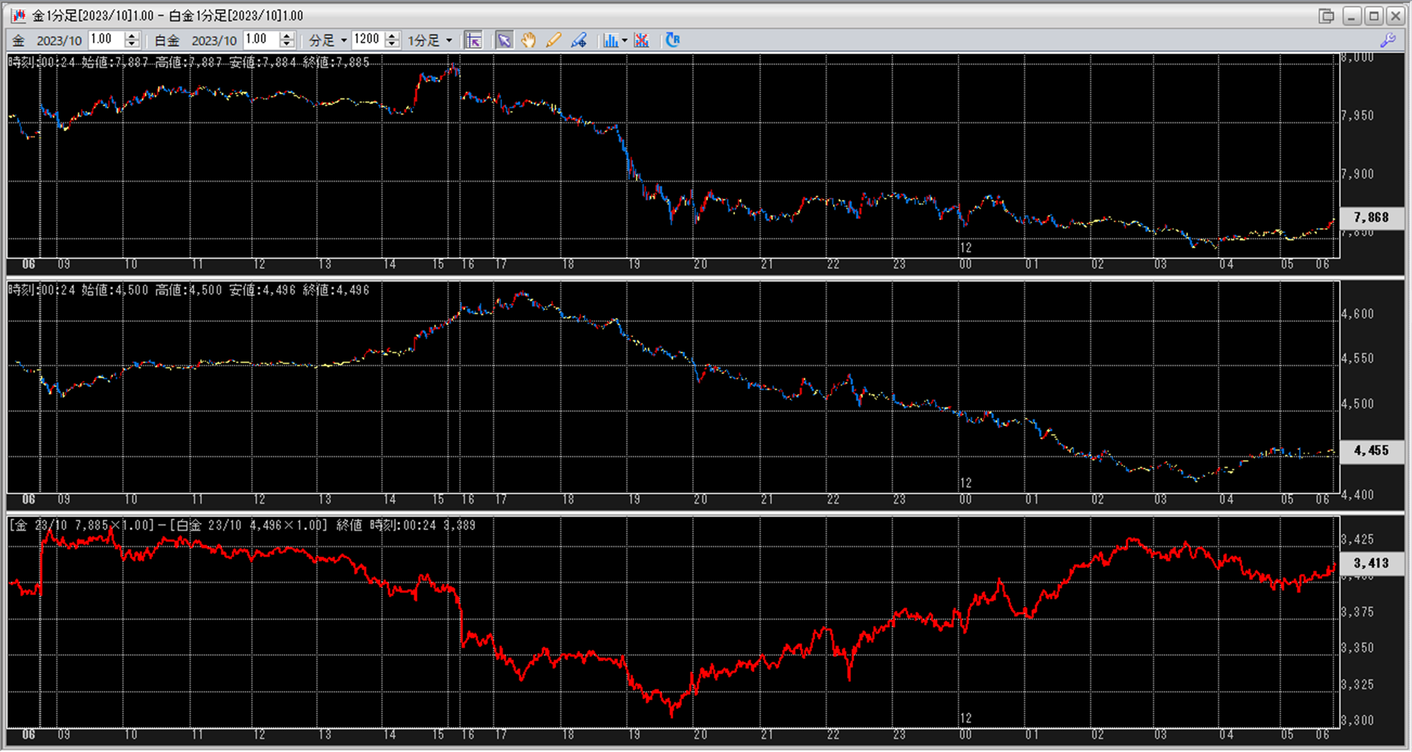 下:金白金鞘(金白金の価格差 = 金1グラムの価格 - 白金1グラムの価格)