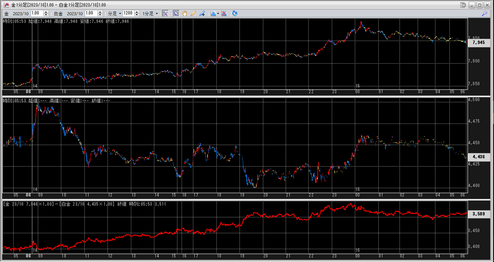 鞘が拡大したので、鞘縮小の仕掛け金売り1枚-白金買い2枚を増やしましたが、