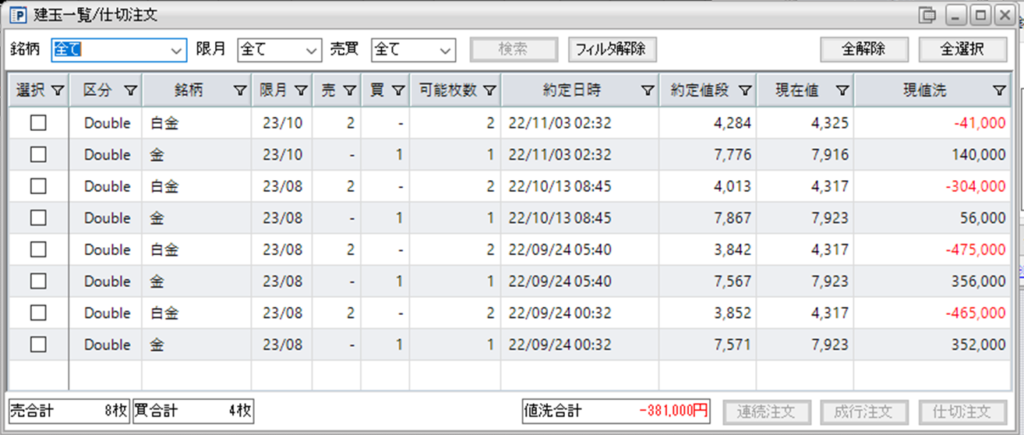 現在、鞘拡大の仕掛け金買い1枚-白金売り2枚の4組を保持しています。