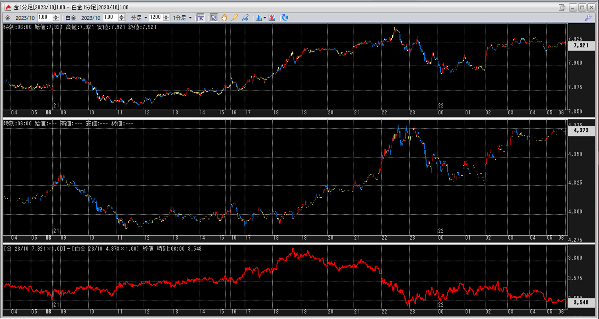 下:金白金鞘(金白金の価格差 = 金1グラムの価格 - 白金1グラムの価格)