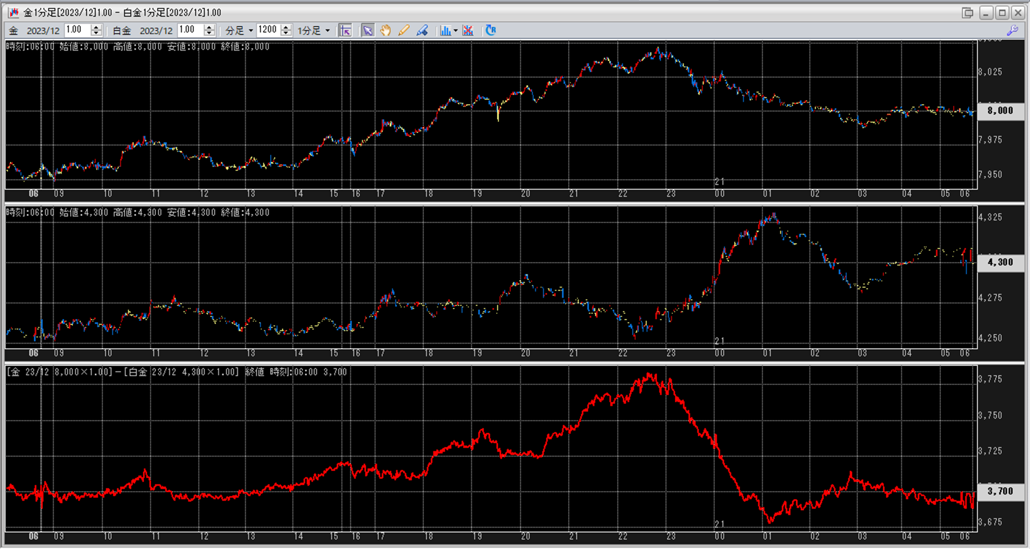 建玉としましては、鞘拡大の仕掛け金買い1枚-白金売り2枚を3組を保持しています。