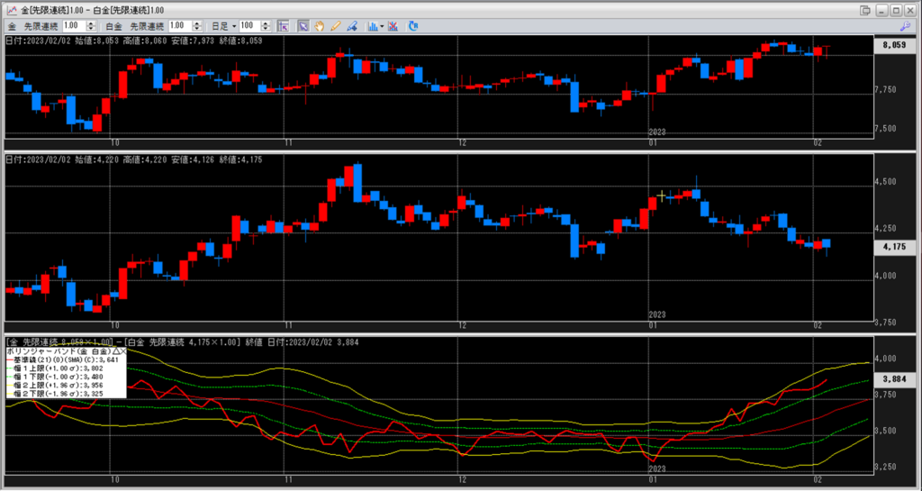 金白金の鞘をボリンジャーバンドで見ていきます。