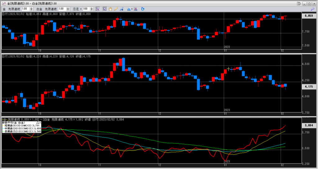 下記に金白金鞘の移動平均線のチャートを貼り付けています。