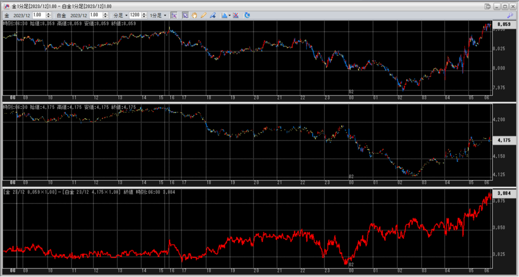 鞘拡大の仕掛金買い1枚-白金売り2枚を仕切りましたが、