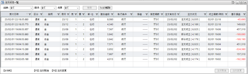 鞘拡大の仕掛金買い1枚-白金売り2枚を4組を全て利確し、