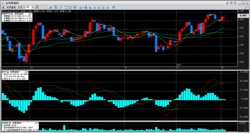 金のチャートをみると、8,000円と短期線を超え続けています。