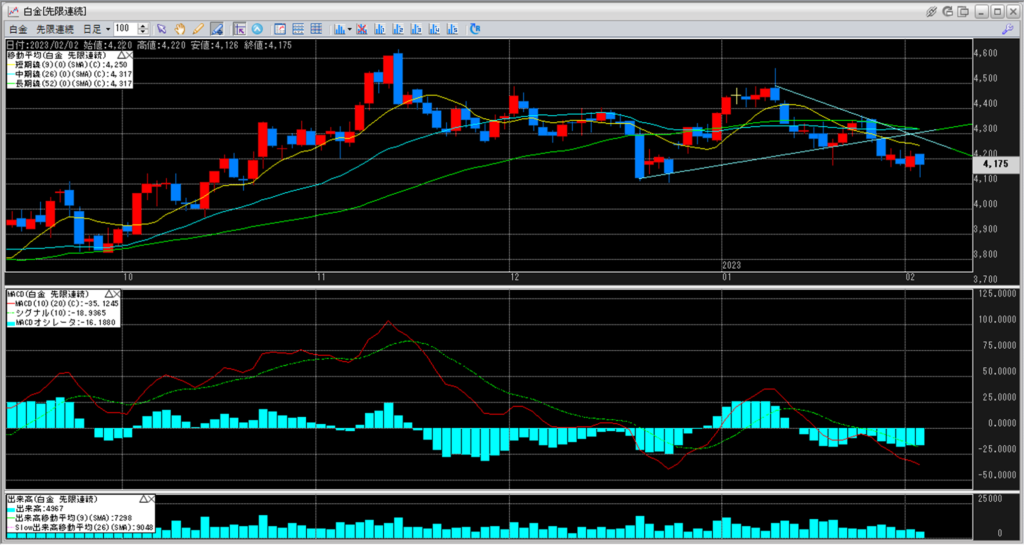 白金のチャートを見ると、4,250円から4,500円のボックス圏相場を