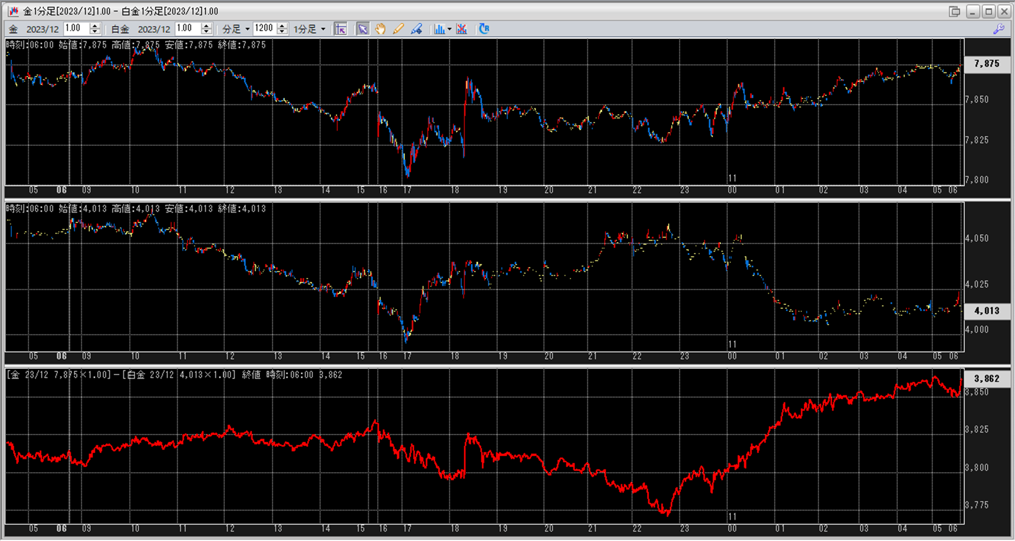 どこかで鞘拡大の仕掛金買い1枚-白金売り2枚を建てていければと考えています。