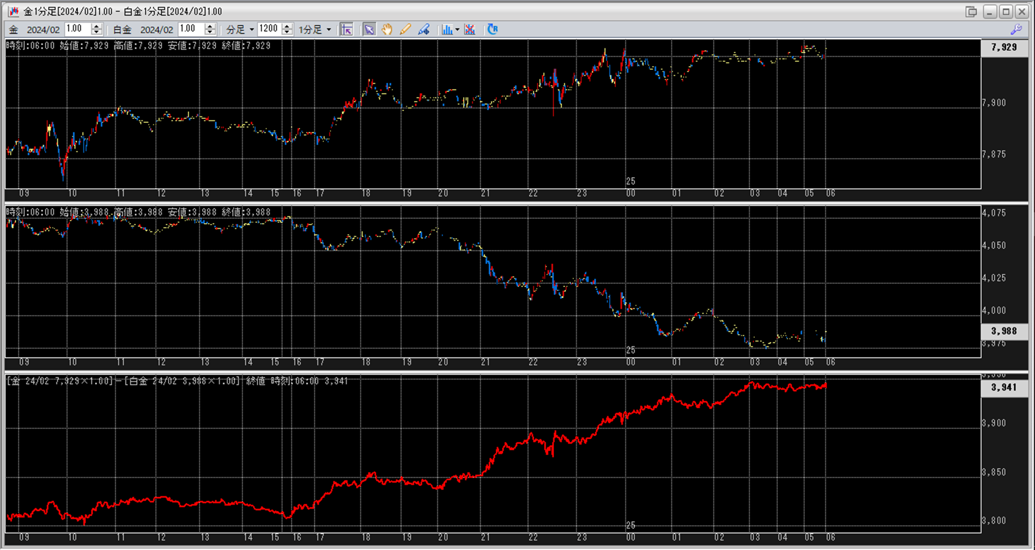 建玉としましては、鞘拡大の仕掛け金買い1枚-白金売り2枚を2組を保持しています。