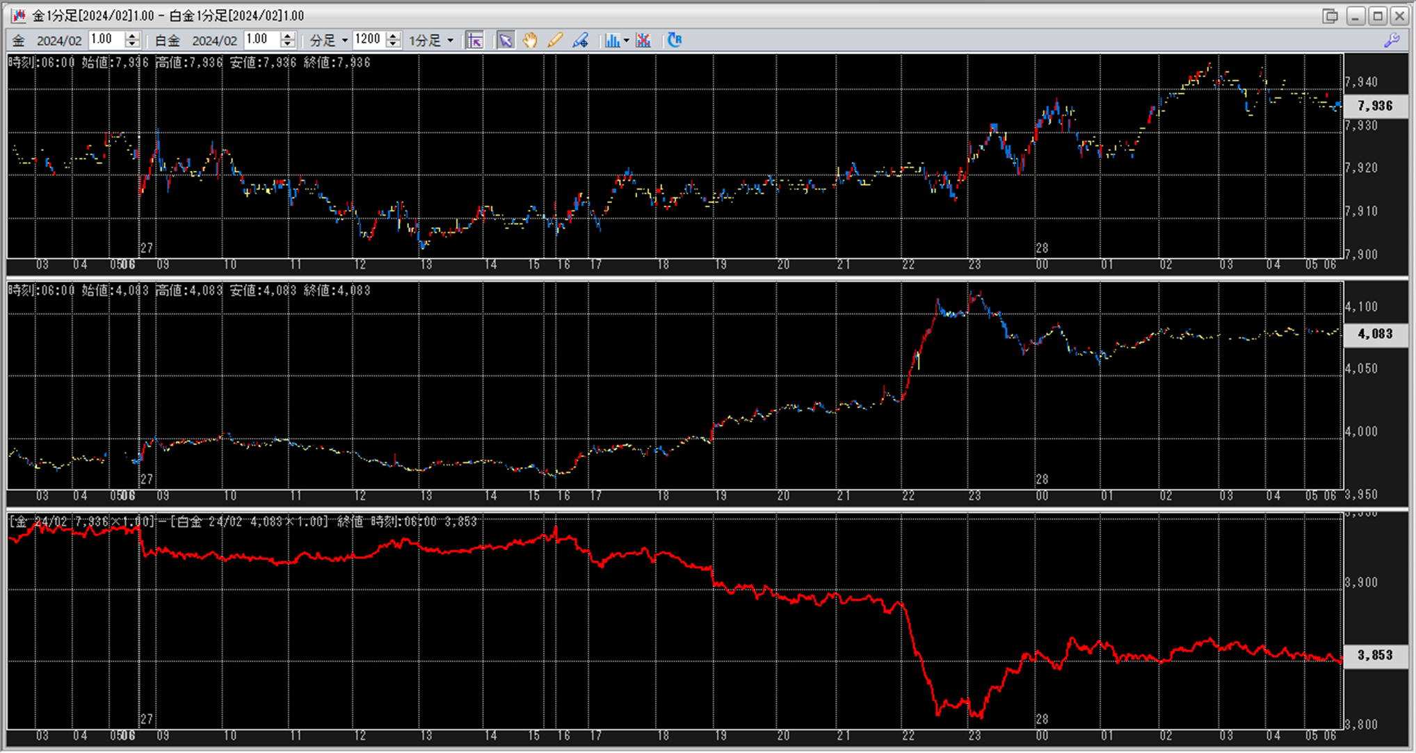 建玉としましては、鞘拡大の仕掛け金買い1枚-白金売り2枚を2組を保持しています。