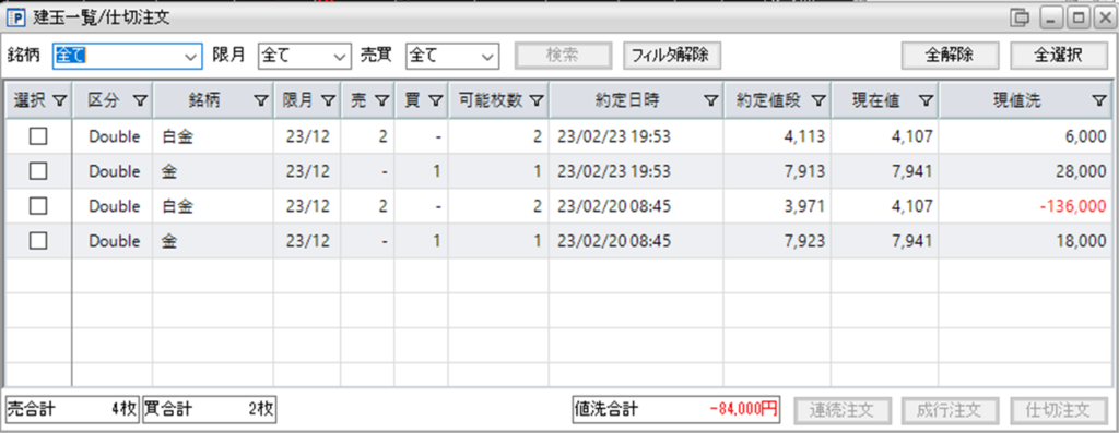 現在、鞘拡大の仕掛金買い1枚-白金売り2枚を2組、保持しています。