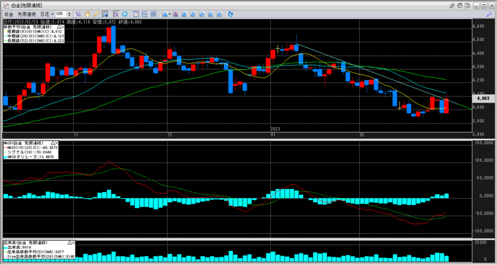 白金のチャートを見ると、4,250円から4,500円のボックス圏相場を